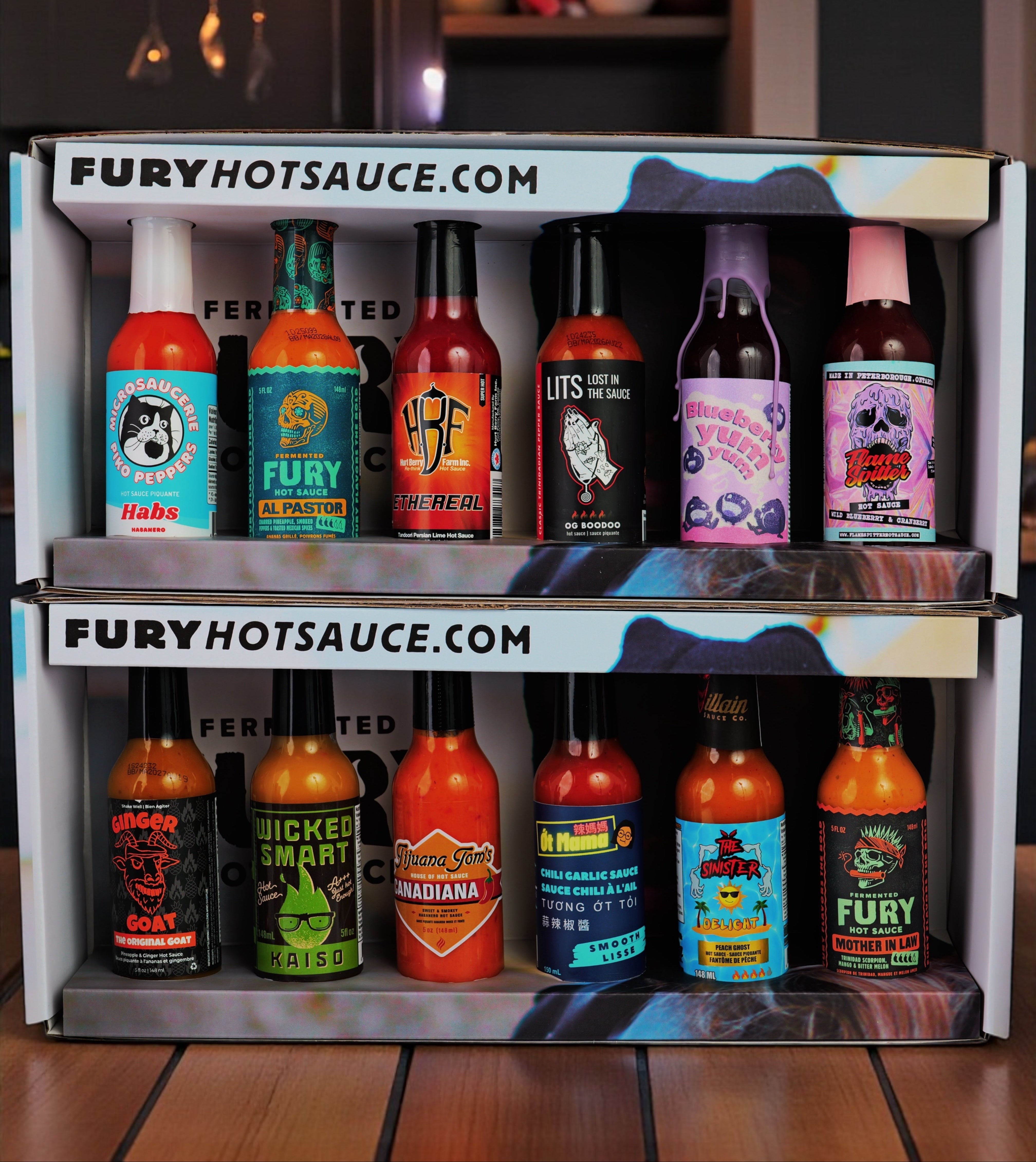 The Box Of Fury is the ultimate hot sauce experience for the hot sauce enthusiast! Why choose-- Let us decide. Each box is different, featuring 6 bottles of Fury for your discovery and enjoyment. Surprise and delight your tastebuds. The ultimate hot sauce collection.